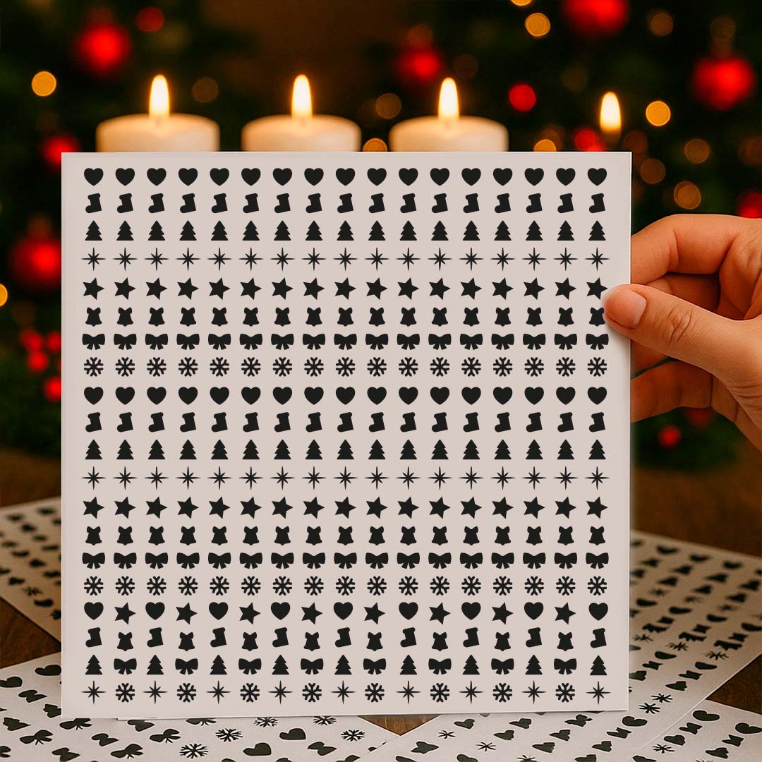 * Figuras para velas navideñas. * Incluye transportador para pegado. * Contiene 340 figuras. |